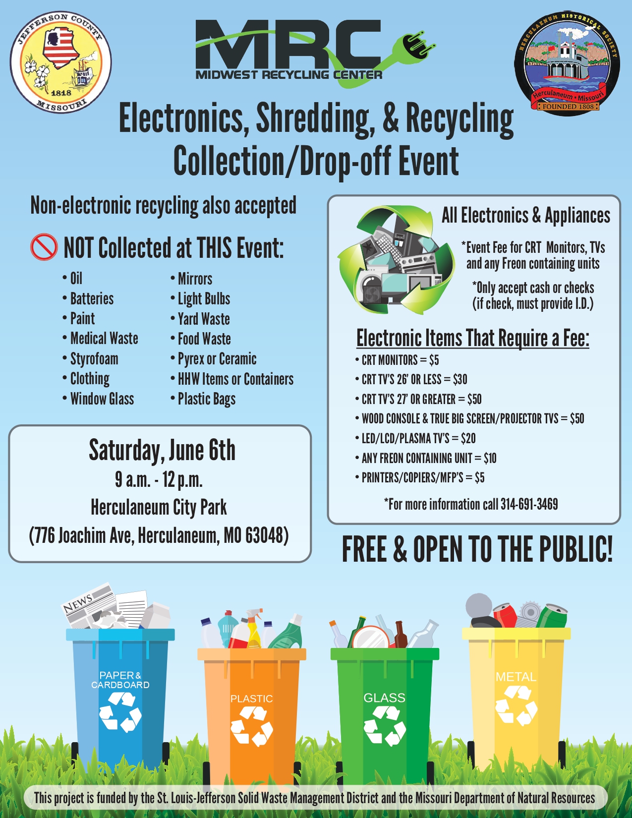 Here’s a clean, ready-to-publish blog post version of your flyer: Electronics, Shredding & Recycling Drop-Off Event in Herculaneum If you’ve got old electronics, paper clutter, or recyclable materials piling up, here’s a great opportunity to clear them out responsibly. The Midwest Recycling Center (MRC) is hosting a community recycling and shredding event in Herculaneum—open to […]